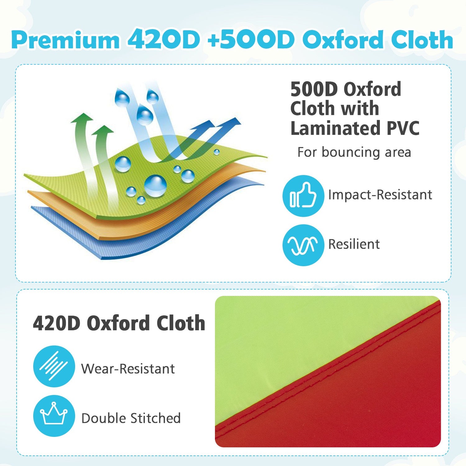 Crafted from high-quality 420D Oxford cloth, this inflatable is strong, durable, and built to withstand energetic play. Double-stitched seams enhance abrasion and tear resistance for long-lasting performance. Surrounding ventilated mesh walls provide excellent airflow while elevating safety, allowing parents to supervise easily. The round climbing door ensures convenient access to the jumping area.