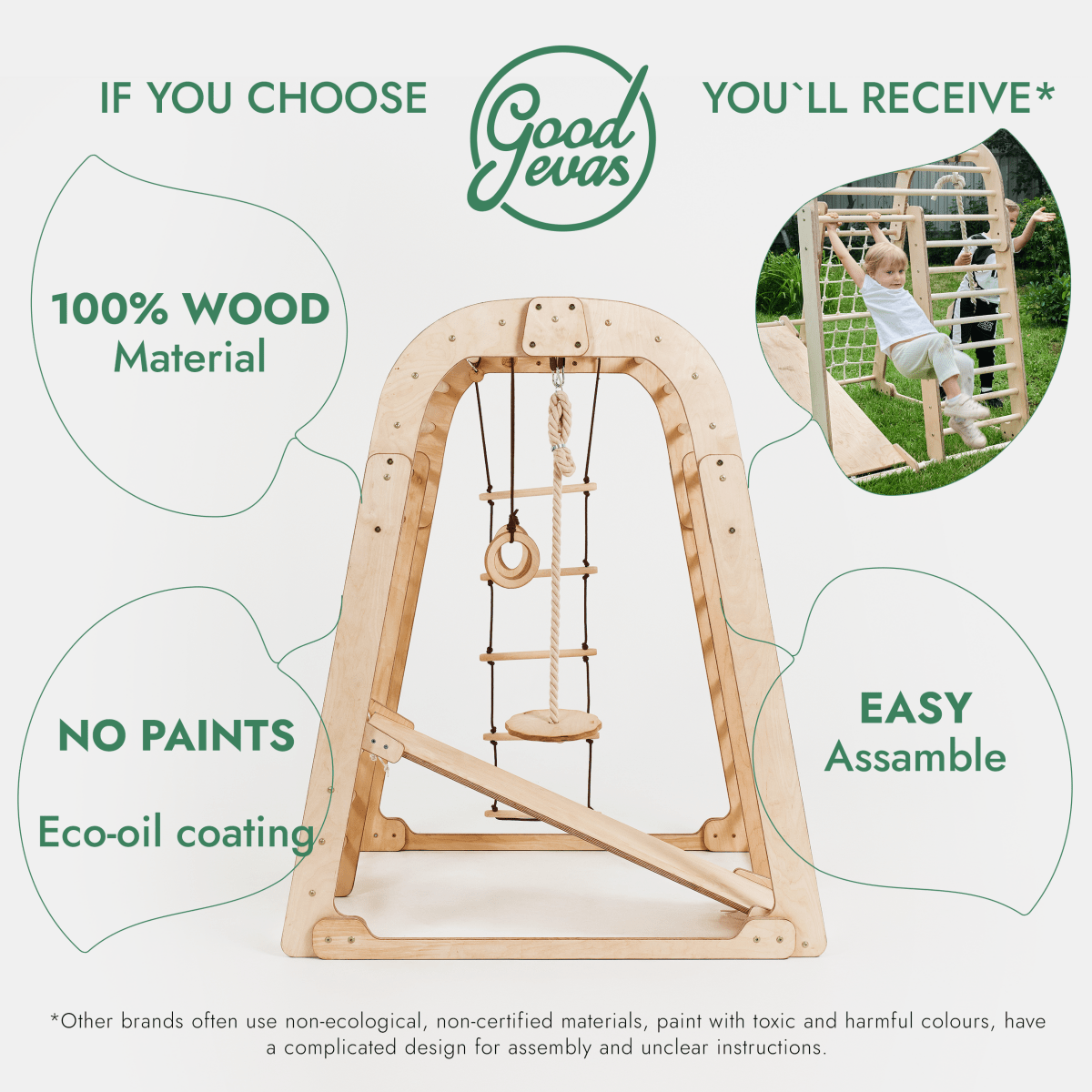 Introducing the Kid's Playground, a meticulously crafted, multi-functional climbing structure inspired by the Montessori approach. Designed for children aged 3 to 8 years old, this playground empowers young explorers to hone skills such as balance, coordination, and motor capabilities — all in the spirit of fun! The structure boasts: