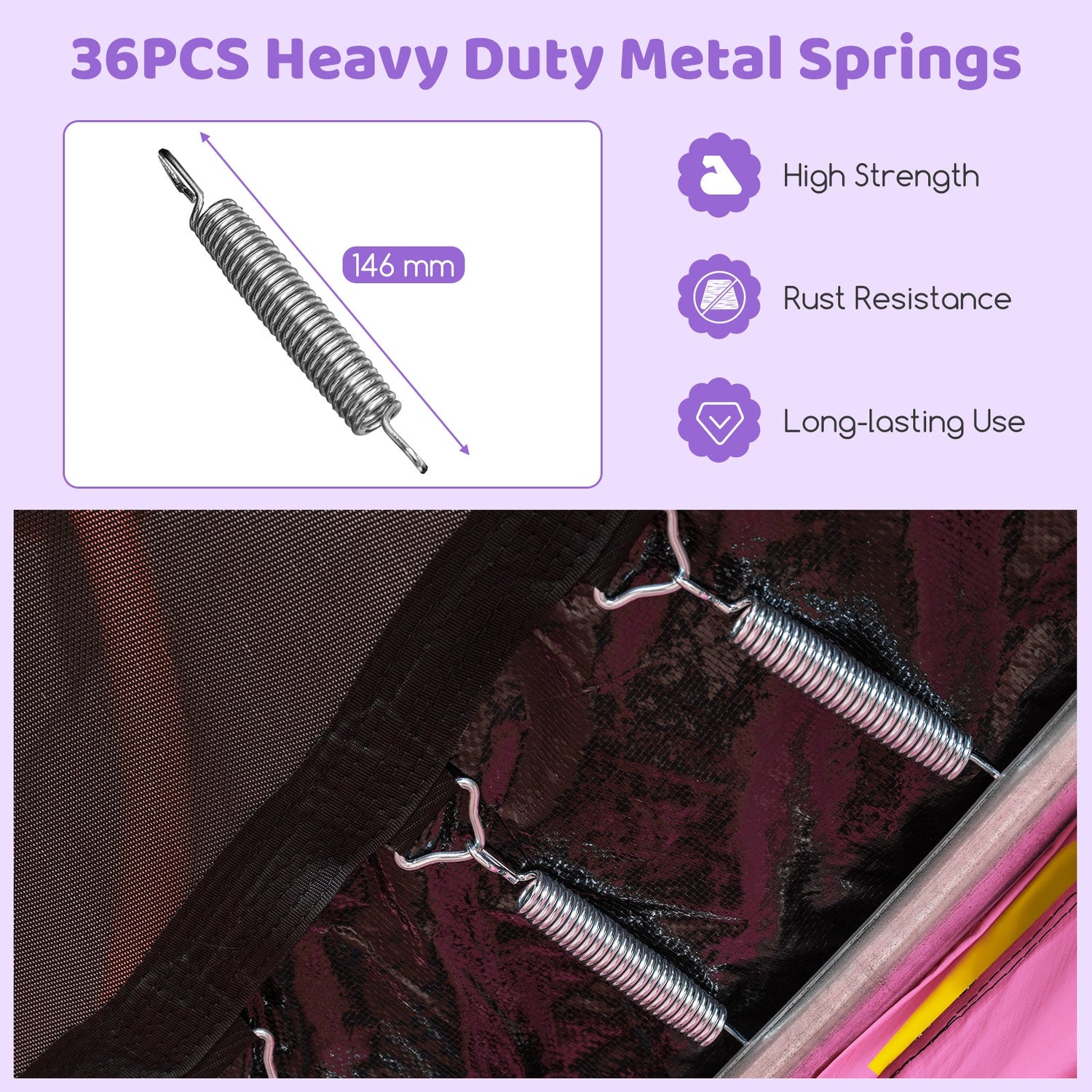 Designed for excellent performance, the trampoline features a high-resilience, tear-resistant, and waterproof jumping mat paired with 36 strong metal springs that provide higher and more stable bounce. The galvanized steel tube frame and widened, curved base enhance overall stability and help prevent tipping during energetic play.