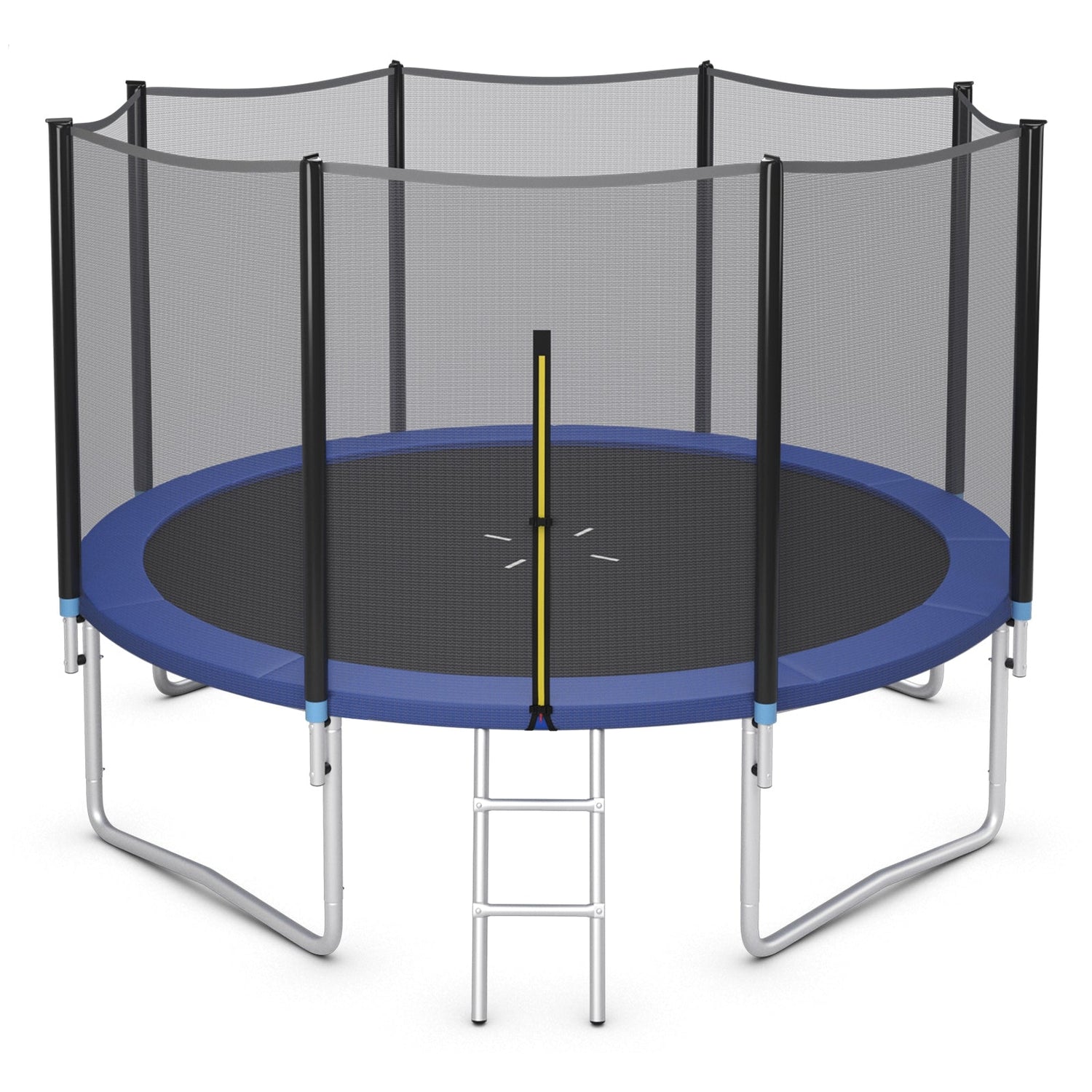 Designed with safety as a priority, this trampoline complies with ASTM F381, ASTM F2255, and EN71 standards to provide peace of mind during play. The seamless design ensures there is no gap between the jumping mat and the enclosure net, reducing potential hazards. A steel ladder is included for convenient and safe access.